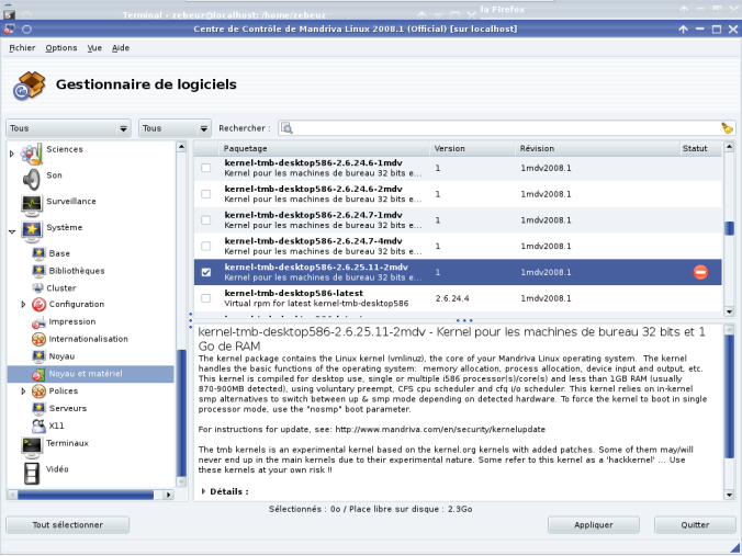 Personnellement, j’ai choisi le dernier noyau "tmb" disponible à savoir le 2.6.25.11-tmb-desktop586-2mdv.
