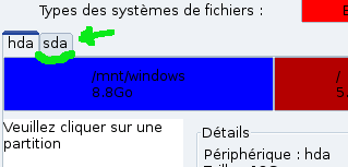 Vous devez voir plusieurs onglets dénommés hda, hdb, sda, sdb... Tous ceux qui commencent par hd sont des disques durs internes IDE. On n’y touche pas ! Pour les sd, ce sont soit des disques SATA, soit votre disque dur USB (ou votre clef usb). Soyez sûr de prendre le bon pour ne pas risquer d’écraser les données de votre disque dur interne SATA. Si vous ne savez pas le reconnaitre, si vous avez un doute, arrêtez-là ! Dans tous les cas, c’est le moment de vous dire que je (l’auteur de ces lignes) ne suis pas responsable des dégâts : vous avez fait vos sauvegardes et pris toutes les précautions !