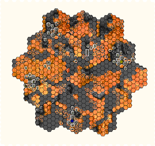 Bekymy sent le danger et prépare à nouveau une attaque sur mon astronef. Il avance un crabe avec GT et char. Psychomat met 10 points en réserve. Tullamore, que je pensais moribond, relance une nouvelle attaque, attaque que l’on sent désespérée puisqu’il laisse en pleine campagne deux chars et un crabe qui n’ont pas eu le temps de revenir protéger son astronef.