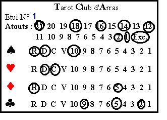 Une fois la partie terminée, on compte les points normalement que l’on reporte sur la feuille de notation jointe à l’étui (feuille qu’il est interdit de regarder avant pour ne pas influencer le choix du contrat). Ensuite, les joueurs reconstituent leur " main " à l’aide du diagramme (cf. exemple ci-contre). La distribution est ainsi reconstituée et on remet chacun des paquets dans sa poche avec sa carte témoin. L’étui est prêt à être joué à la table d’à côté.