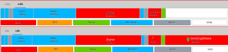 Au redémarrage, on travaille désormais sur une partition /home chiffrée par dm-crypt qui se trouve sur l’emplacement oriiginel de l’ancienne partition /home. Après avoir vérifié que mon home est désormais affublé d’un boulier vert et que tout fonctionne, Il reste à supprimer la partition temporaire et agrandir la partition windows pour lui rendre son espace... ou supprimer le dossier /home du disque USB de votre conjoint, le remettre où vous l’aviez trouvé, jurer que vous n’y avez jamais touché et qu’elle peut de toute façon retélécharger sa série TV préférée.