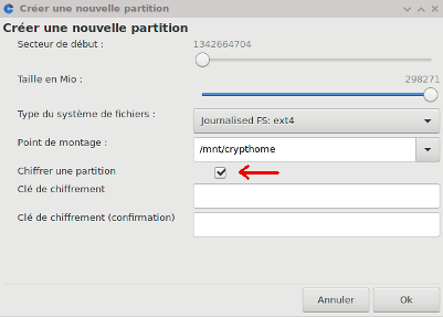 Au redémarrage, votre /home pointe maintenant sur la partition temporaire, ce qui va nous permettre de reformater l’ancienne partition, toujours avec diskdrake. Mais cette fois, en cochant la case "partition cryptée".