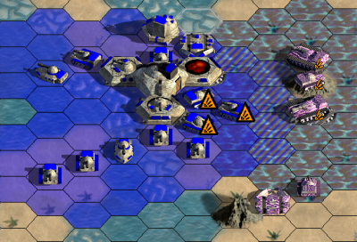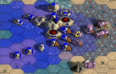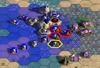 De ce fait, il vient neutraliser le dernier char bleu actif avec le GT le plus près de l’astronef. Il capturent alors un premier char (marque C jaune).
