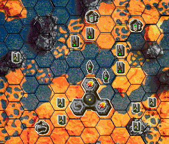 Je pars à l’attaque et détruis la tourelle marine de l’astronef weikien. Arkhus ne peut plus sortir sa barge sauf au prix d’un détour énorme. Pour le dissuader de faire cela, je laisse mon Gt et mon char près de ses deux tourelles, il est obligé de dépenser tous ses points pour capturer mon GT et le mettre ainsi hors d’état de nuire.